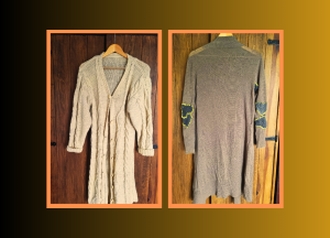 I fixed my cardigan and wore it for my first-ever art exhibition (I went back to Uni in September 2021). I loved fixing it, and I absolutely loved how it worked out (Photo below). This summer, I also received a knitted cardigan from my aunt, which she had made for herself in the 1980s. When I was growing up, I absolutely adored it and always dreamed of wearing it.